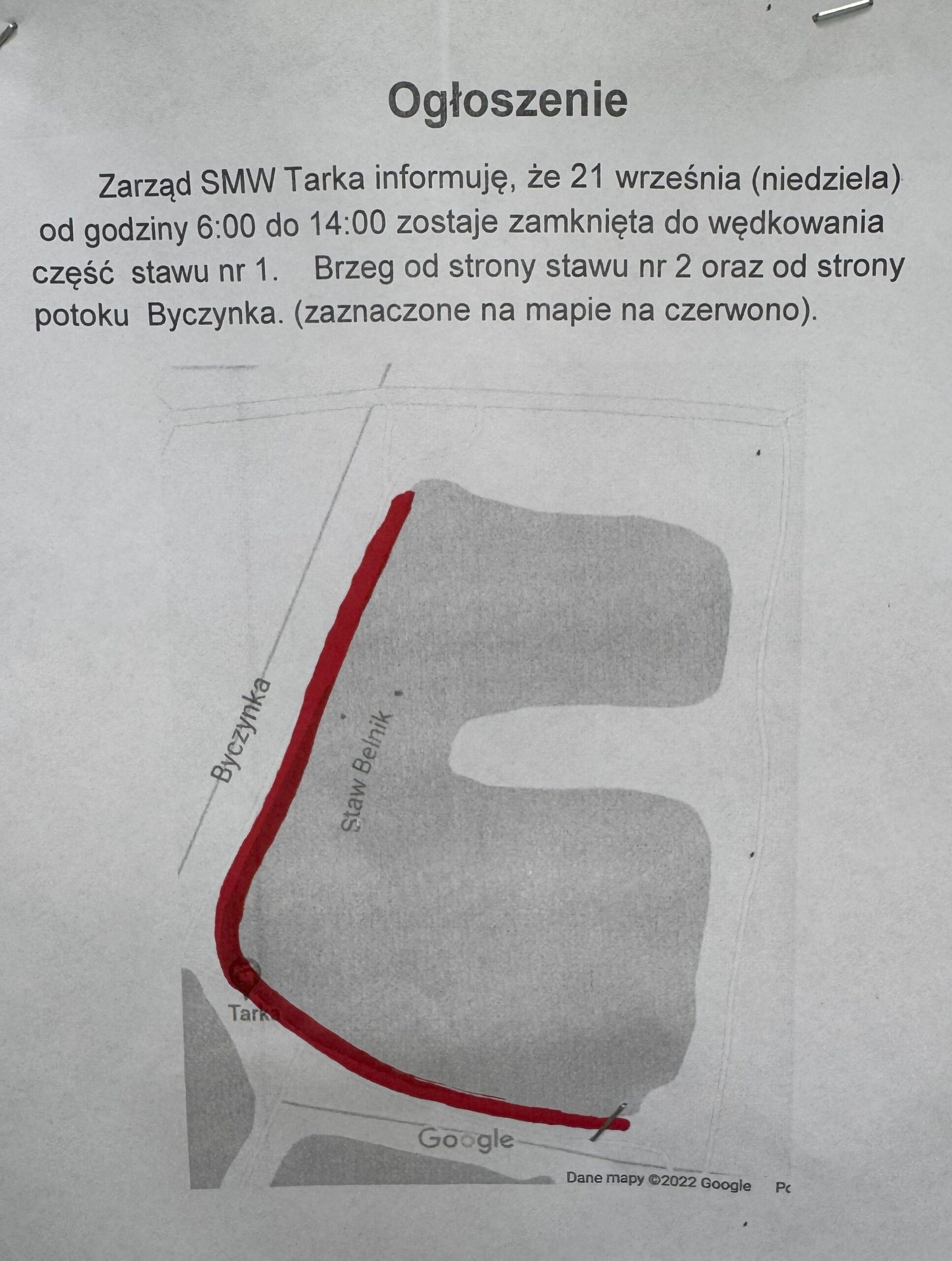 Zarząd SMW Tarka informuje, że 5 października będzie zamknięty do wędkowania staw nr 1 od godziny 5:00 do zakończenia zawodów .